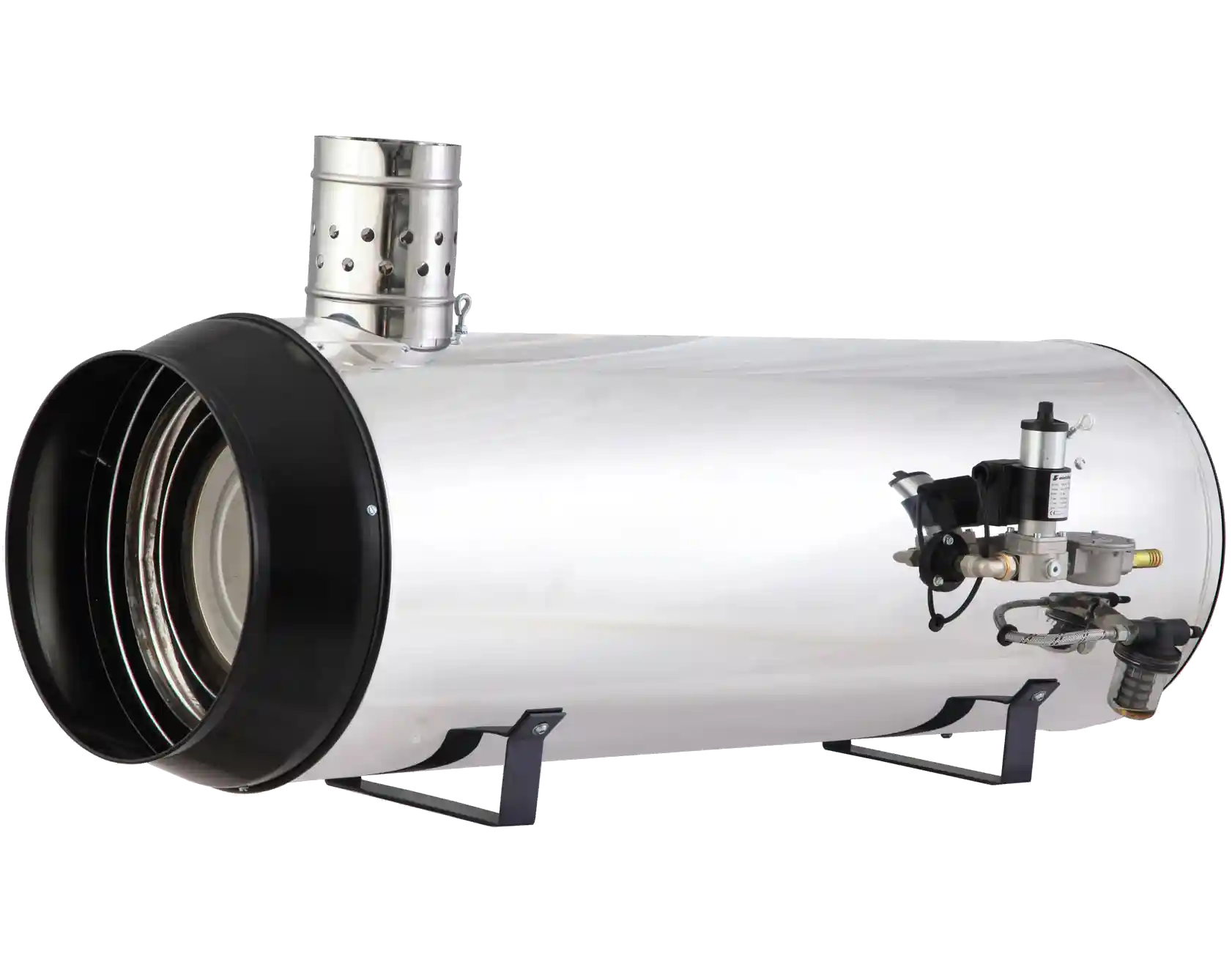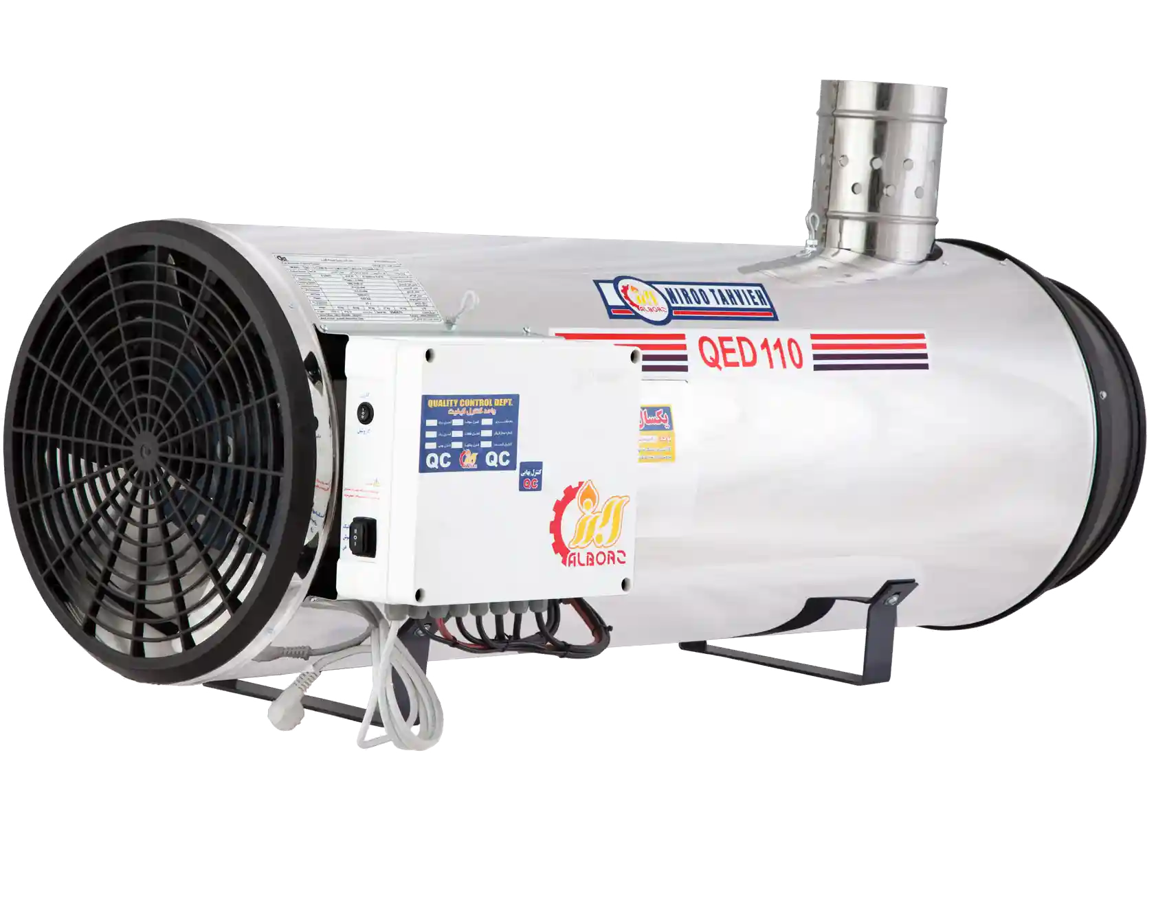 جت هیتر دوگانه سوز دودکش دار البرز مدل QED-110، با توان حرارتی 60 هزار کیلو کالری در ساعت برای گرم کردن فضاهایی چون گلخانهها، سولهها و سالنهای صنعتی مناسب است.