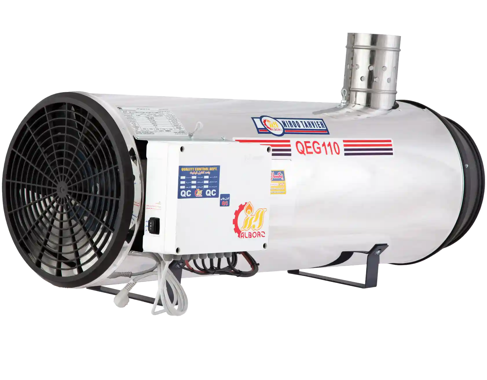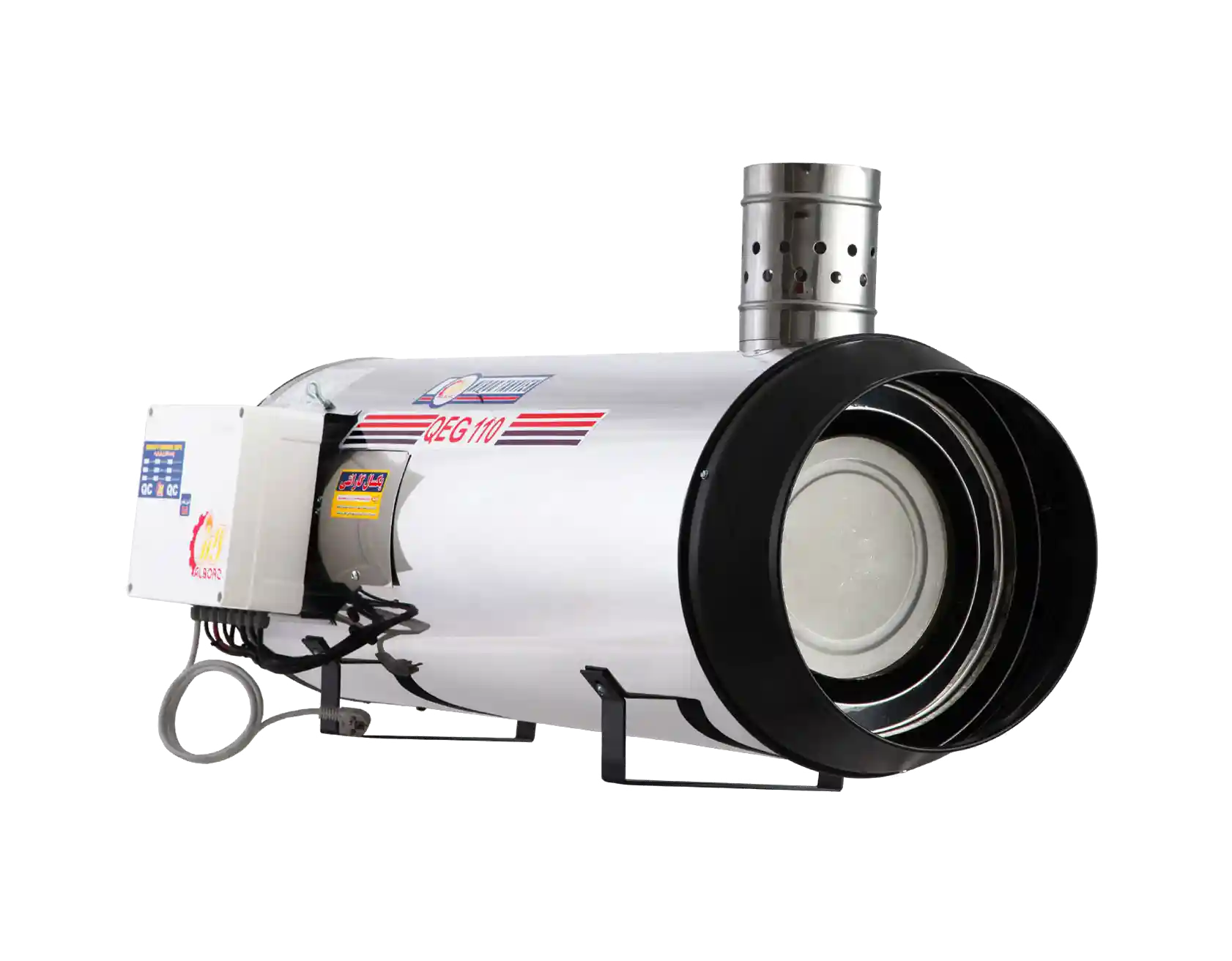 جت هیتر گازی دودکش دار البرز مدل QEG-110، با توان حرارتی 60 هزار کیلو کالری در ساعت برای گرم کردن فضاهایی چون گلخانهها، سولهها و سالنهای صنعتی مناسب است.